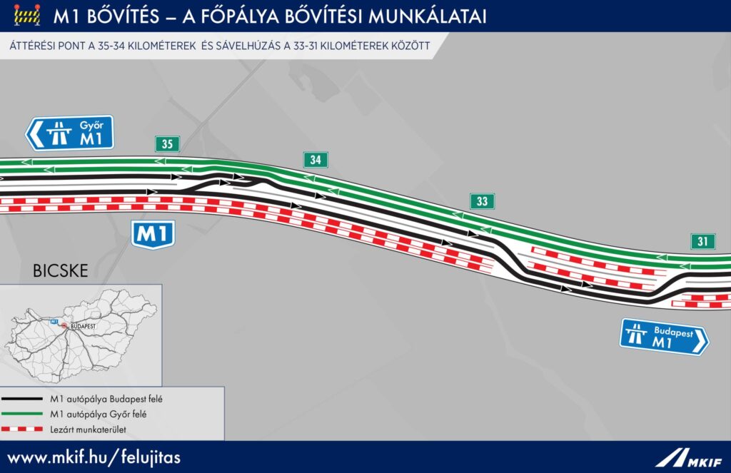 Az MKIF Zrt. tájékoztatása szerint az M1-es autópálya főváros felé vezető oldalán 2026. április 23-án reggel lép életbe az ideiglenes forgalmi rend. A szakemberek a belső elválasztó sávban az új híd támaszait építik, ezért mindkét irányban lezárják a belső sávokat egy körülbelül másfél kilométeres szakaszon.